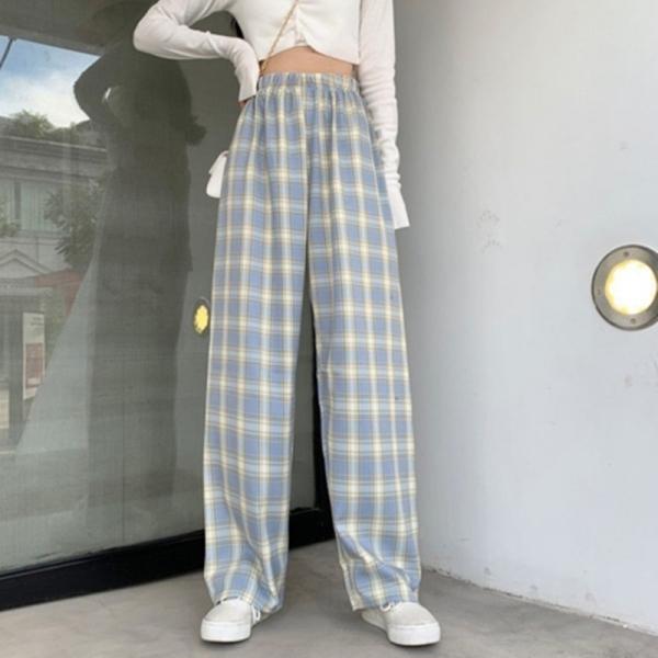 홈웨어 와이드 쿨 여름 밴딩 고무줄 통 바지 체크무늬