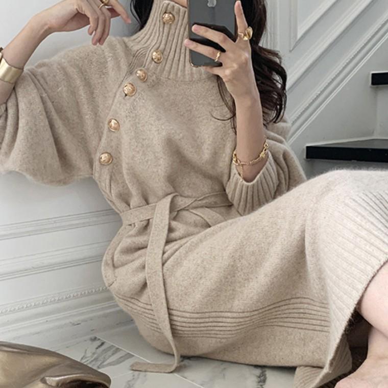 [위드기프트] 럭셔리 금장버튼 하이넥원피스