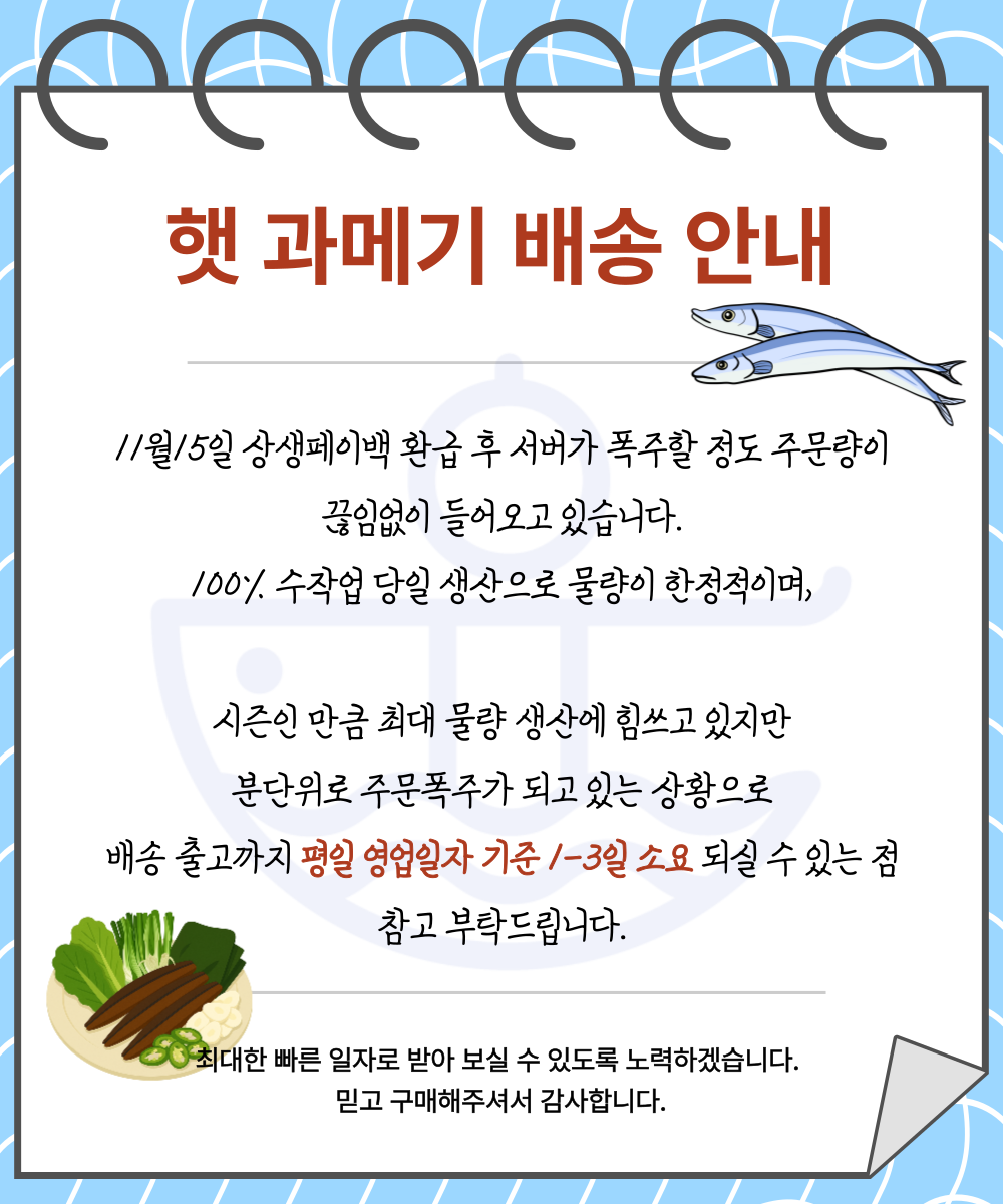 | 사용시 주의사항 | 과메기 원료인 꽁치는 건조시 기름이 많으므로 장이 예민하신분들은 주의 부탁드립니다 |