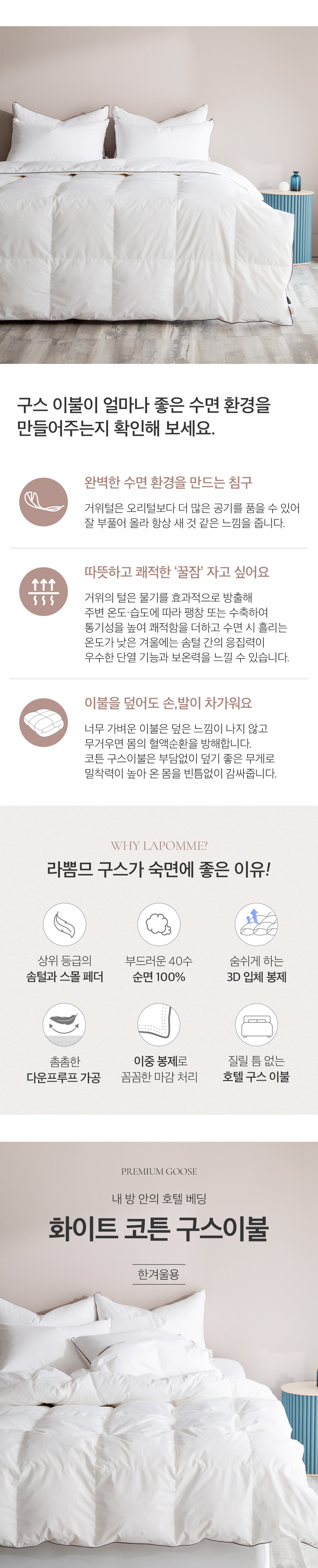 | 세탁방법 및 취급시 주의사항 | * 라뽐므의 모든 침구는 세탁망 사용을 적극 권장합니다. [울코스 세탁, 약한 탈수, 자연건조 하세요~!!(건조기 사용 X) ] * 반드시 상세이미지 또는 라벨 표기데로 세탁하세요~!! * 이외의 방법으로 세탁하여 제품 손상 시에는 교환, 반품 불가합니다. * 제품 사용법 및 문의는 수입원~ 으로. * 반품 및 교환 접수는 복지몰 콜센서~로. |