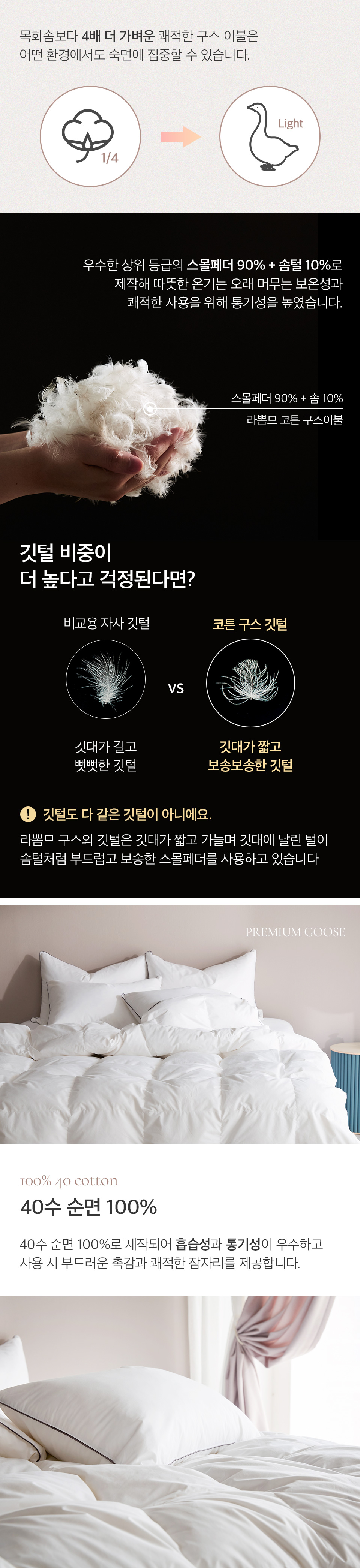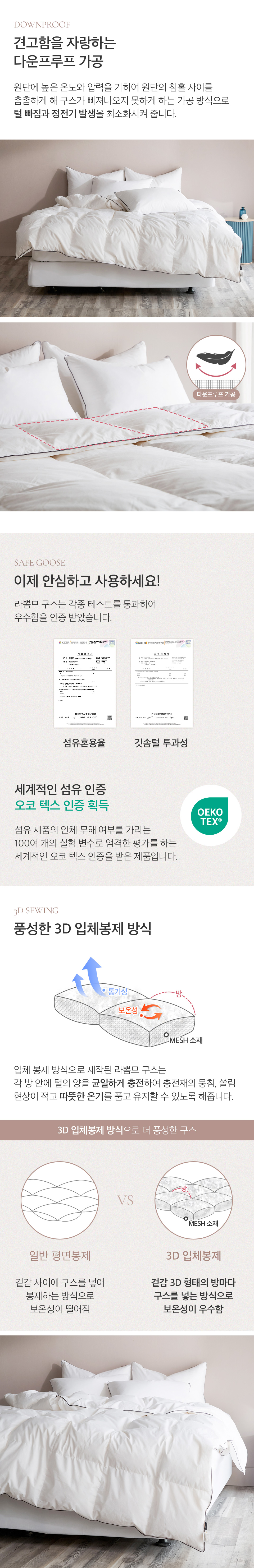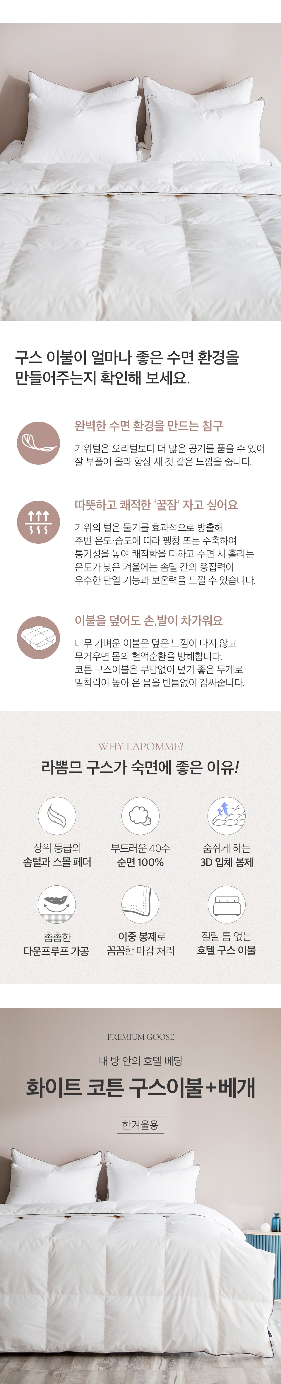 [라뽐므] 화이트 코튼 구스 이불(한겨울용)+구스베개