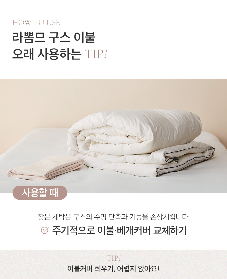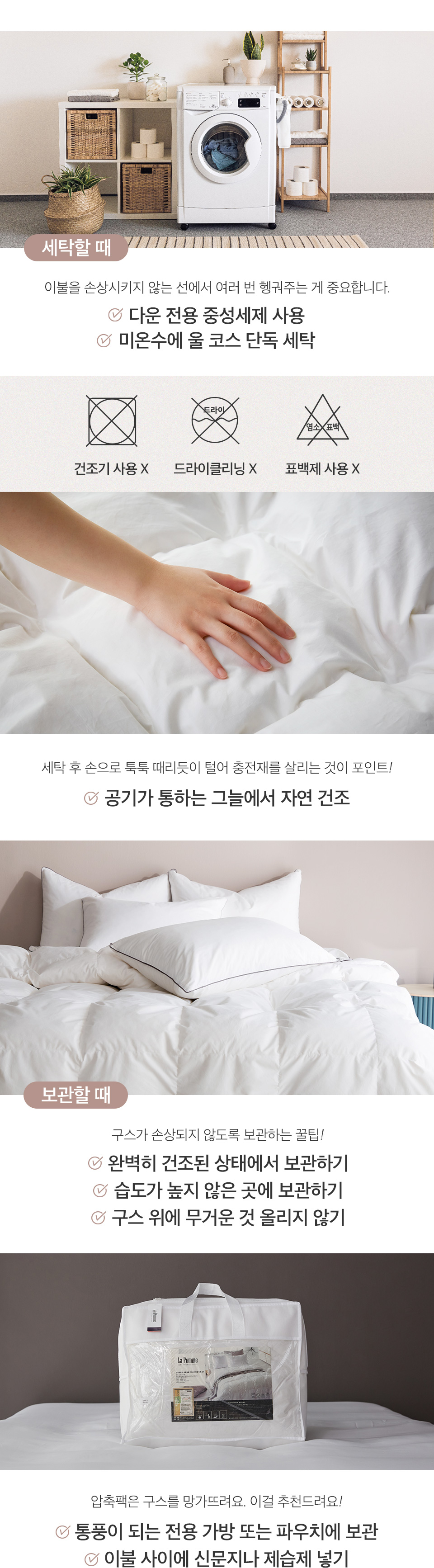 세탁방법 및 취급시 주의사항 * 라뽐므의 모든 침구는 세탁망 사용을 적극 권장합니다. [울코스 세탁, 약한 탈수, 자연건조 하세요~!!(건조기 사용 X) ] * 반드시 상세이미지 또는 라벨 표기데로 세탁하세요~!! * 이외의 방법으로 세탁하여 제품 손상 시에는 교환, 반품 불가합니다. * 제품 사용법 및 문의는 수입원~ 으로. * 반품 및 교환 접수는 복지몰 콜센서~로.