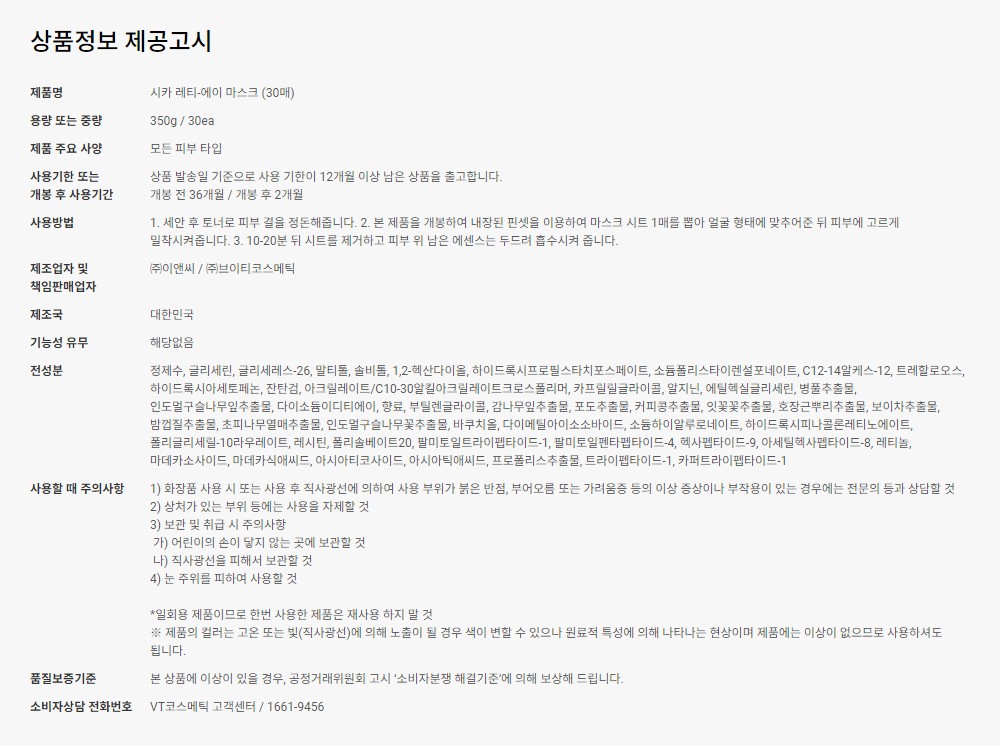 | 제품명 | [VT코스메틱] 시카 레티-에이 마스크(30매)_VTPD40004 |