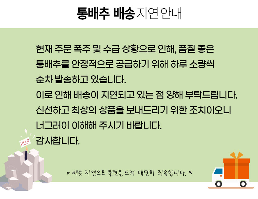 2.배송은 지역에 따라 2~3일 소요를 기본으로 하나, 주문량이 많거나 택배사의 사정, 천재지변 등의 사유로 유동적일 수 있습니다.